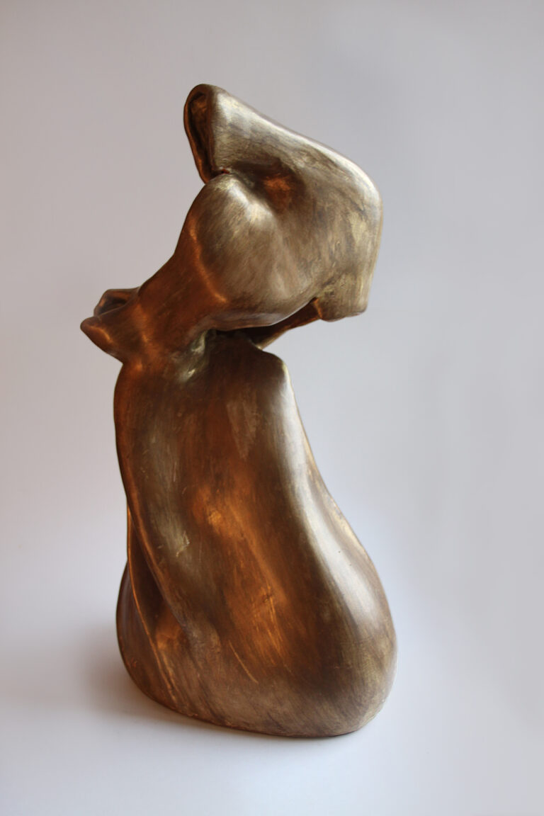 Façonnée en terre cuite, Abrazio s’est imposée au fil des mois comme une évidence. À chaque étape, la matière m’invitait à lâcher prise, à écouter le mouvement qui s’esquissait. Cette pièce m’a appris la patience : celle qu’exige la recherche de la ligne juste, du souffle intérieur qui traverse la forme.